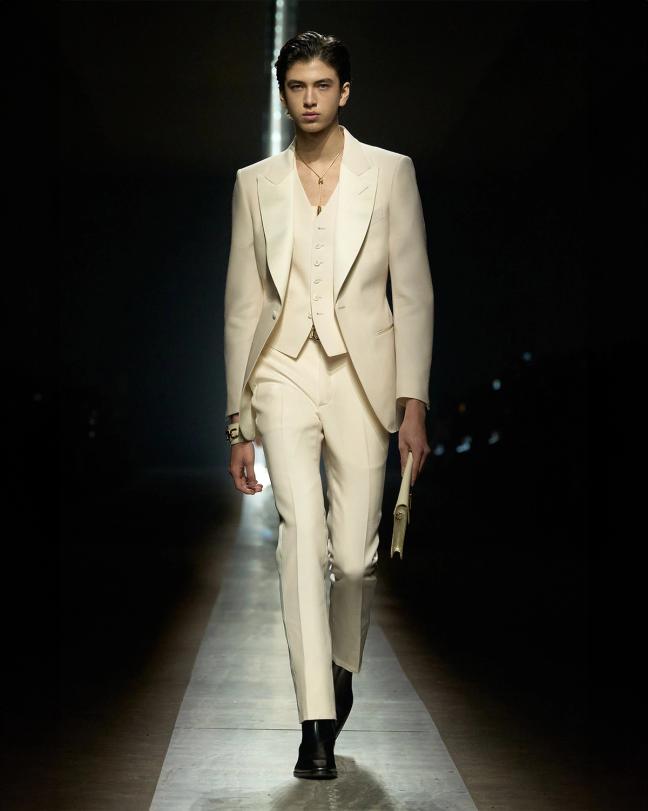 Strength of man came through sharp silhouettes. Fit is extremely important to Hawkings and that was evident with faultless tailoring. Single-breasted pinstriped suits were razor sharp in construction, cut slim to the body and complemented with figure-hugging and ever-so-slightly cropped waistcoats. They were sexy, but not in the old Tom Ford way where it was thrown in your face. These were subtle in their sexiness. A waistcoat worn sans shirt, for instance, flashed an appropriate bit of skin. Cream evening suits, similarly, weren't paired up with shirts and were given a Seventies flare: long-jackets, deep lapels, cinches waists and broader shoulders. Gold lamé blazers were skinny in fit, and were matched up with poker-straight trousers. Tom Ford's signature sunglasses up top. Hawkings presented power tailoring at its very best.