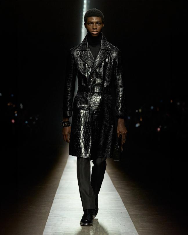 Elsewhere Hawkings, like most other designers in Milan (Prada, Ferragamo et al) jumped on the big military trend. Perhaps a reference to the tumultuous state of the world, he sent a World War One-vibing, camel wool trench coat down the catwalk. But this was less free for movement as those 20th century coats were and was drawn in at the waist to accentuate the figure of the male models wearing it and worn with matching camel slacks and brown leather stomper boots. Meanwhile alligator coats were belted at the waist, again playing with the silhouette of the male the clothes that fit him.