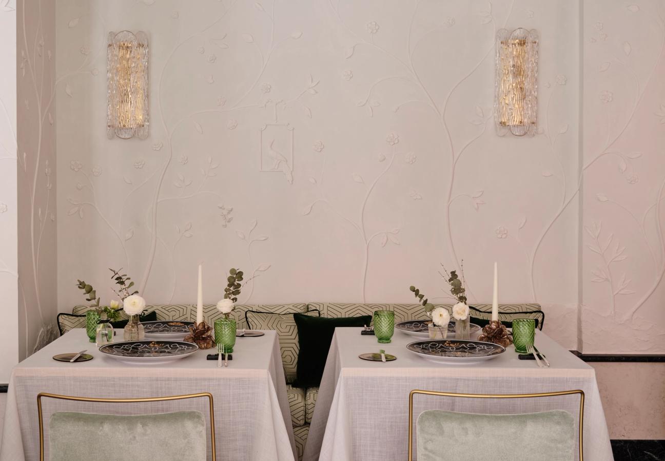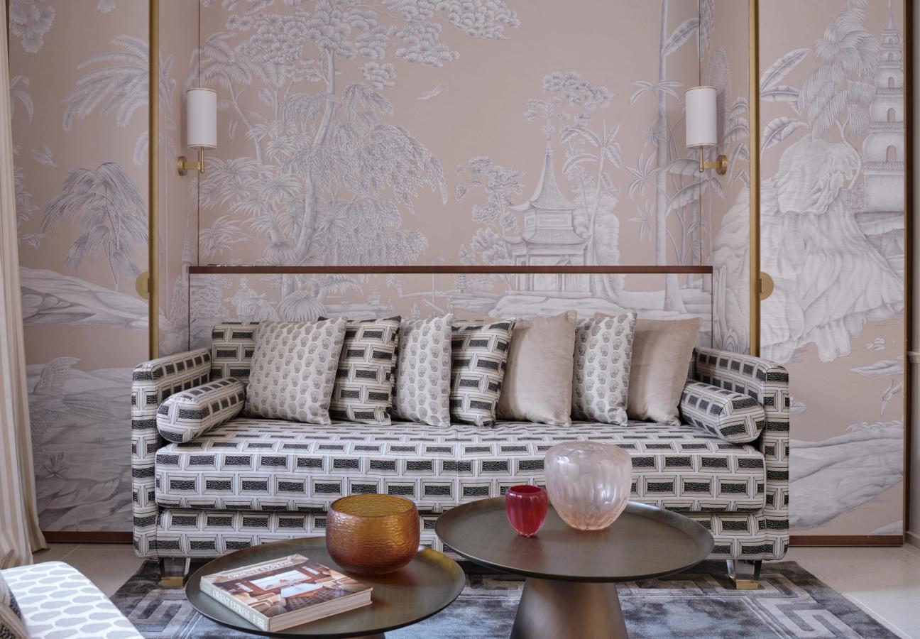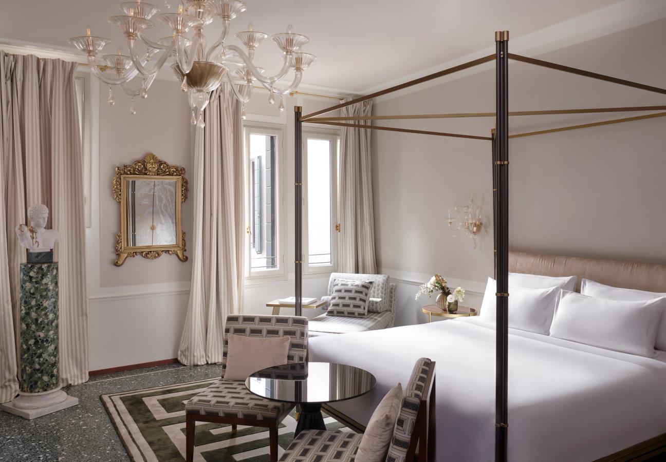 The destination was Violino d’Oro, a truly Italian palazzo and a masterpiece by Sara and Elena Maestrelli. Since its opening in late 2023, the five-star boutique hotel has embraced its central location and endeavoured to showcase everything that is so special about Venice. Paying homage to the rich cultural and artistic heritage of the city, the team champions its deep history and ensures it remains at the heart of everything they do. Italian identity runs deep throughout the hotel, with every fabric, piece of furniture, plate, and glass crafted between Venice and Tuscany, highlighting the Violino d’Oro ethos of sustainability through its choice of local yet timeless pieces. In every nook of the palazzo, a myriad of exquisite craftsmanship is on display. One’s attention may be captivated by an original Venetian seminato handmade by one of the oldest artisan families, or by the three large Poliedri chandeliers that illuminate Violino d’Oro’s entrance, the heart and soul of Venetian glassmaking. These subtle yet deliberate accents work in unison to celebrate this heritage, and there is an all-encompassing sense of preservation and protection surrounding the rich magic that envelops Venice.