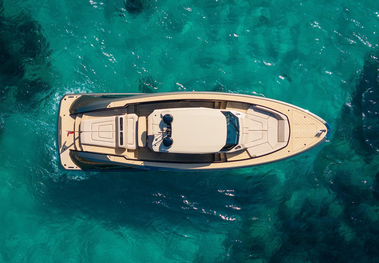 On the exterior, there’s a fixed roof that helps instantly separate this model from its siblings, offering coverage to a large area of the cockpit in order to shade guests during the height of the summer heat. (A retractable sunshade is there, too, in case more protection is required.) Additionally, at 13m, there is space for sun beds at the rear – a hydraulic ladder facilitates easy boarding – as well as a seating area at the foredeck, the perfect spot from where to take in a sundowner.