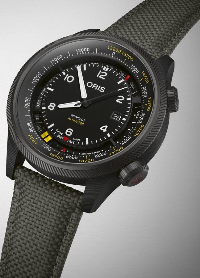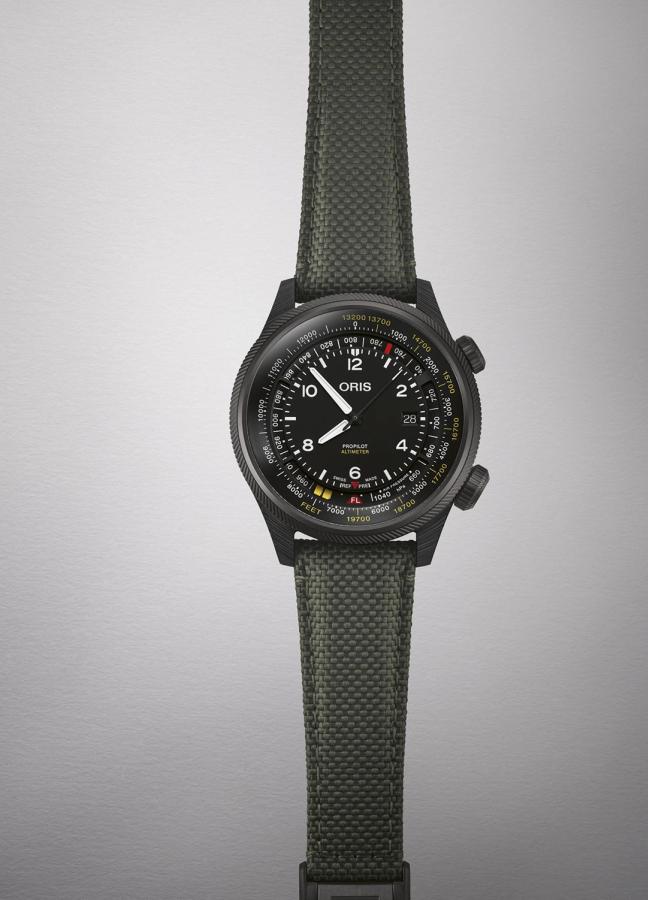 Flip the watch over, and you’ll see the same altitude scale etched into the grey PVD-plated titanium caseback. And, paired with a hardy green textile strap, lined with brown leather, everything about Oris’ latest is as capable as it is cutting-edge.