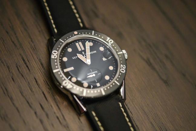 The Ulysse Nardin Dive Le Locle is inspired by an almost identical looking model from 1964, with some minor updates of course. As with the Heuer Autavia above, the steel case has been up-sized to 42mm (from 38mm), which is much better suited to today’s tastes. It also features a sub-dial with cross-hair markings at six o’clock for the small seconds, whereas the original had a central seconds hand. Everything else though, such as those distinctive, baton-shaped luminescent hour and minute hands, looks like it’s been lifted straight from the 1964 model, an impression Ulysse Nardin has re-enforced by giving all the indications on the dial the faux patina treatment to simulate an aged dial. Presented in a polished steel case, the Ulysse Nardin Diver Le Locle has lovely facetted lugs and a uni-directional, black-coated aluminium bezel with a nice glossy finish.