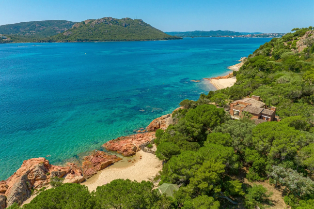 Built in the 1970s near a renowned local fishing spot in Porto-Vecchio, the low- slung, burnt orange property sits hidden beneath ancient stone pines. On its vast stretch of olive-tree-dotted land (including a second villa and a caretaker’s cottage), this rare property promises complete seclusion and sparkling, crystalline waters