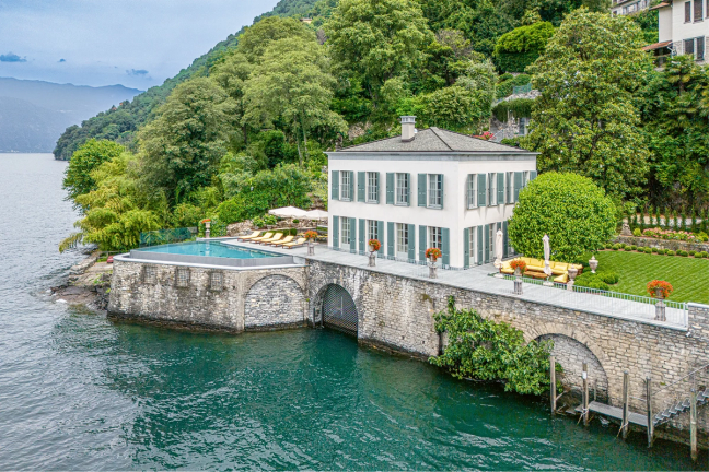 Built on an old fisherman’s dock, this handsome palazzo boasts a lovely infinity pool carved into its pale grey stone. With a jetty and a boathouse, as well as an exceptional, secluded garen and light-drenched frontage, it is one of the more spectacular waterfront offerings on the lake.