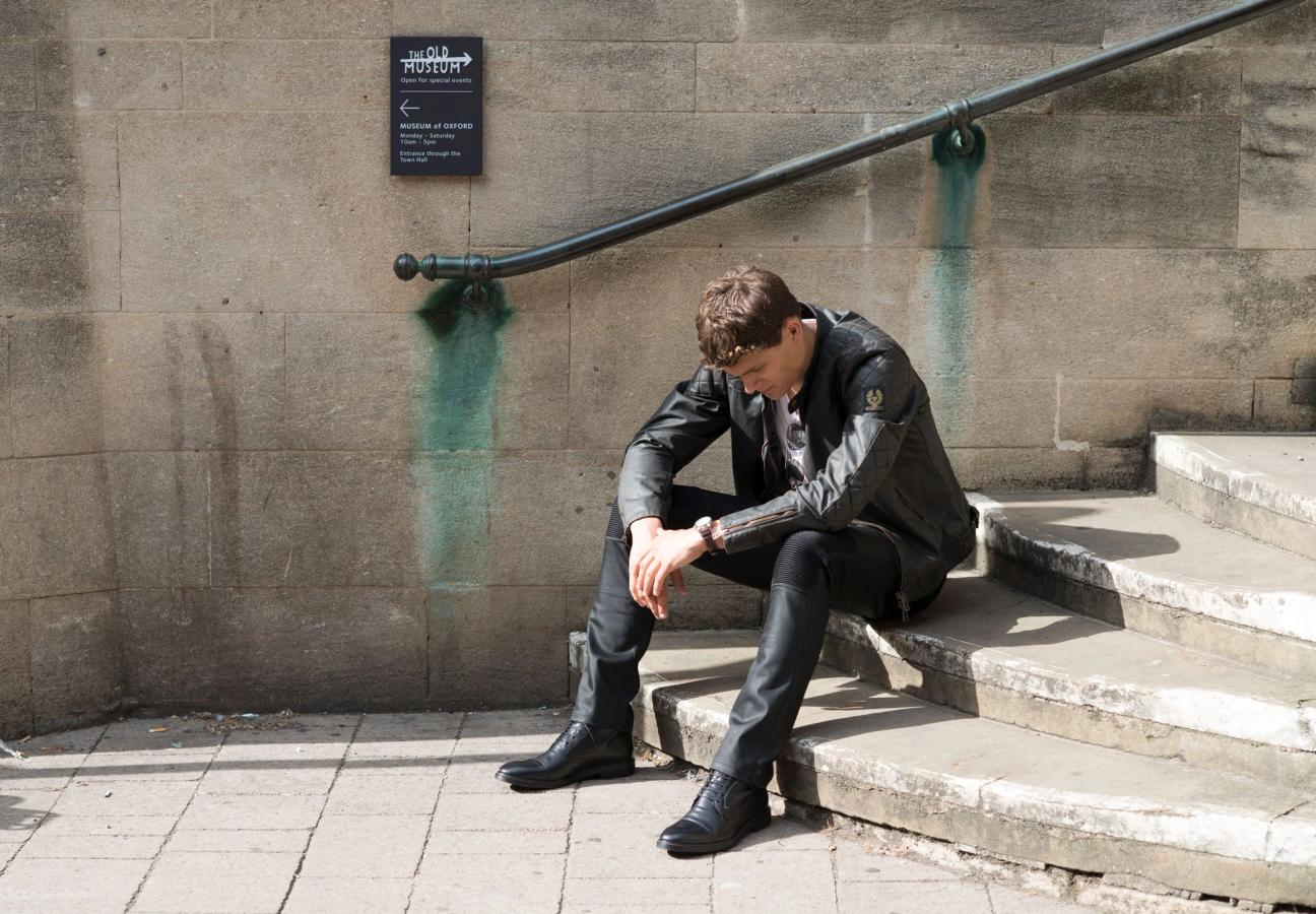 Leather biker jacket, jeans, T-shirt and boots all by Belstaff