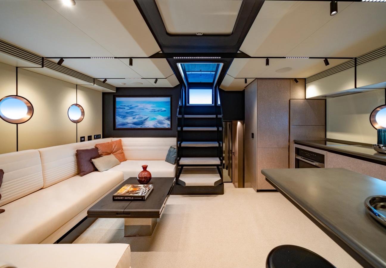 Step below deck and the atmosphere shifts from bold geometry to soft indulgence. Designed by BurdissoCapponi Yachts & Design, the interiors are offered in two curated moods: Cool and Smooth.