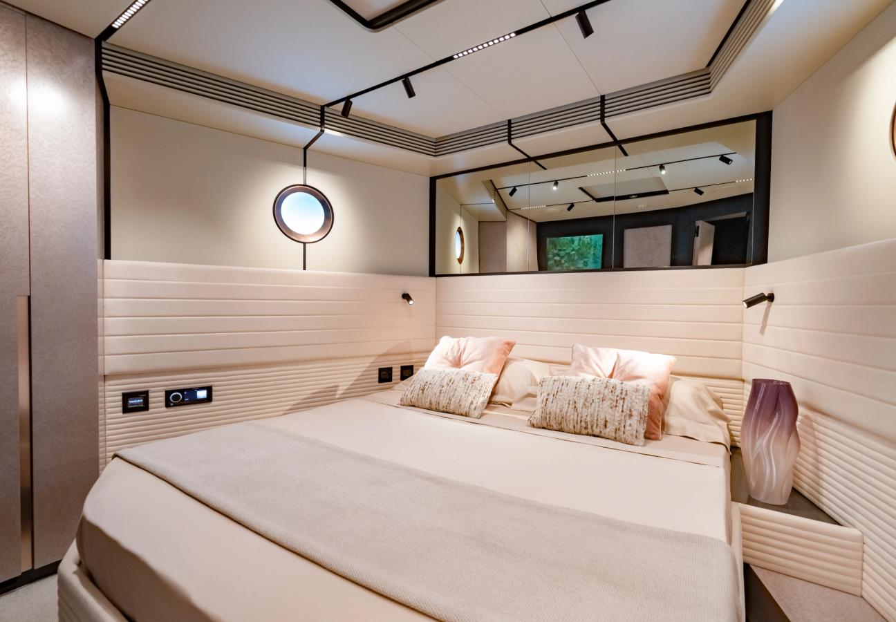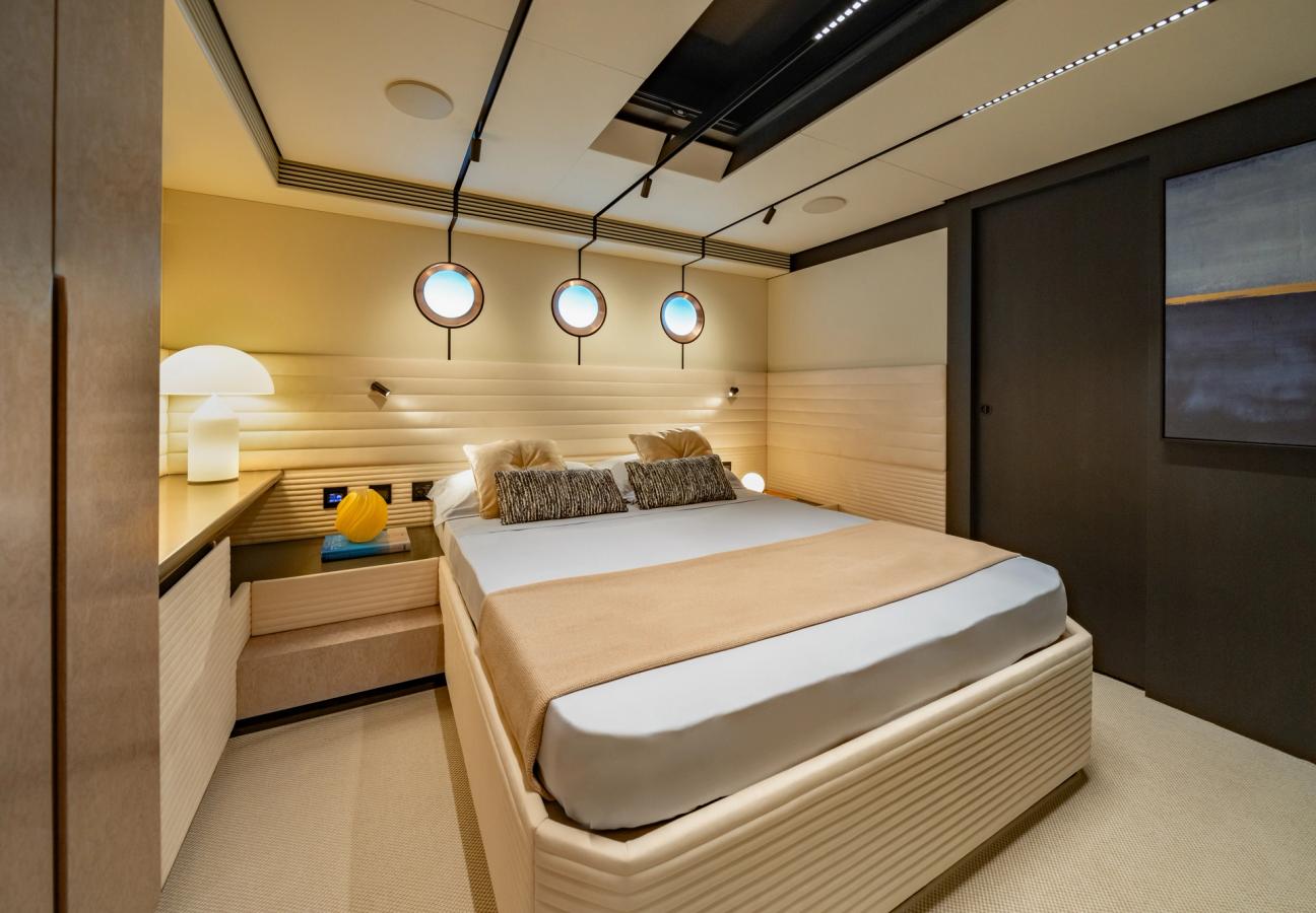 The layout is equally flexible. Owners can opt for a three-cabin configuration, with a starboard master suite, a twin guest room, and a forward VIP. Alternatively, a two-cabin version opens up the aft suite into a private retreat complete with sofa, dressing area, and desk — the sort of refinement one expects aboard much larger yachts.