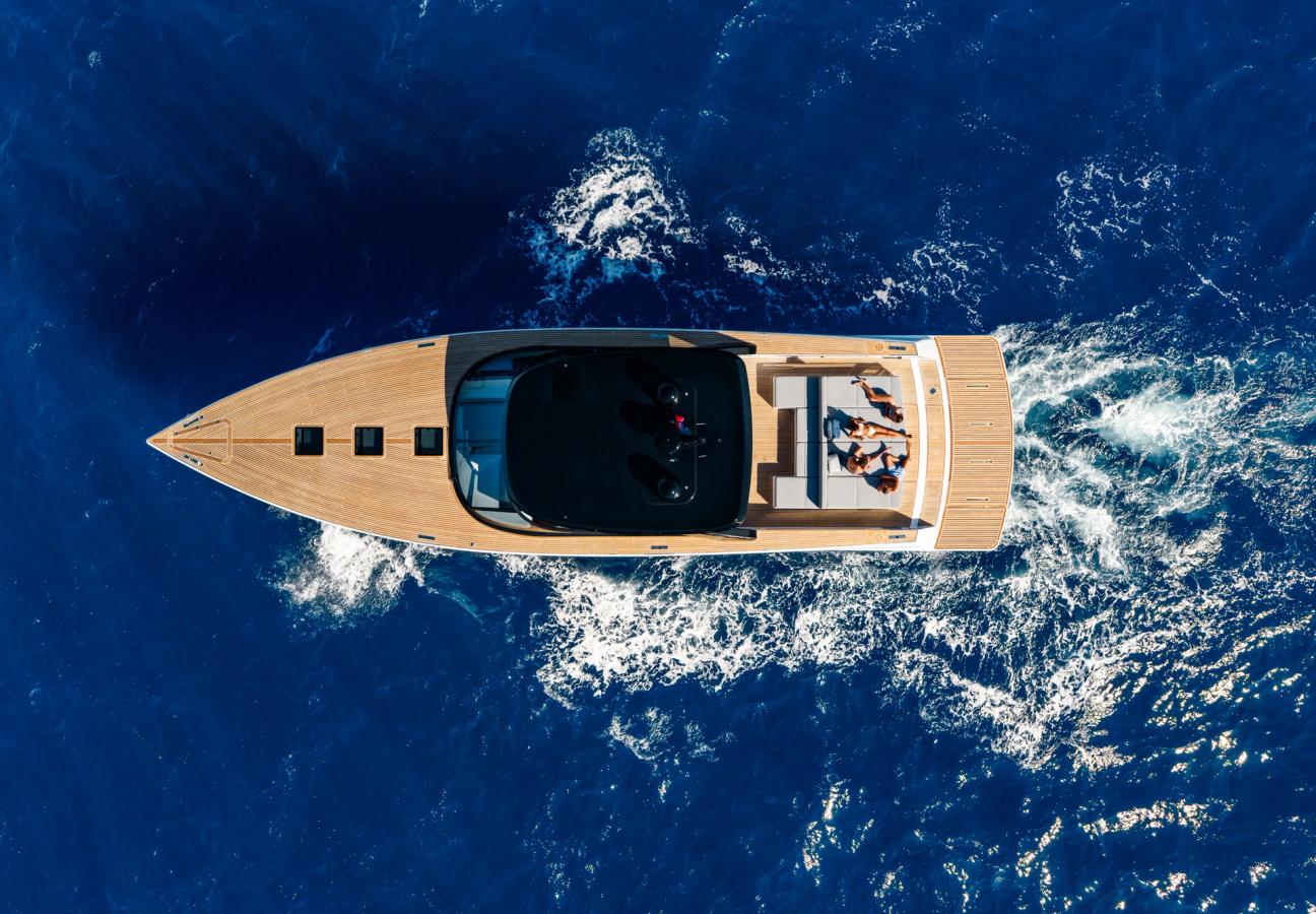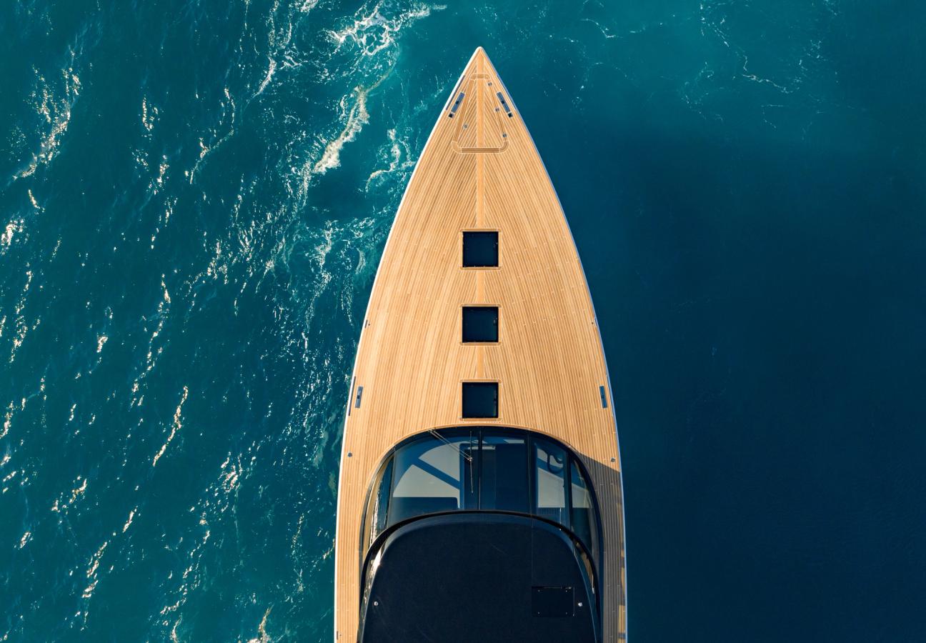 A carbon-fibre hardtop floats above the cockpit like an architectural canopy, shading the expansive 45-square-metre lounge without disturbing the silhouette. The windshield now conceals an integrated door to the foredeck, while a flush, “invisible” anchor mechanism maintains the yacht’s signature clean lines. Even the teak decks have been reimagined — finished with white caulking to emphasise the yacht’s contemporary edge.