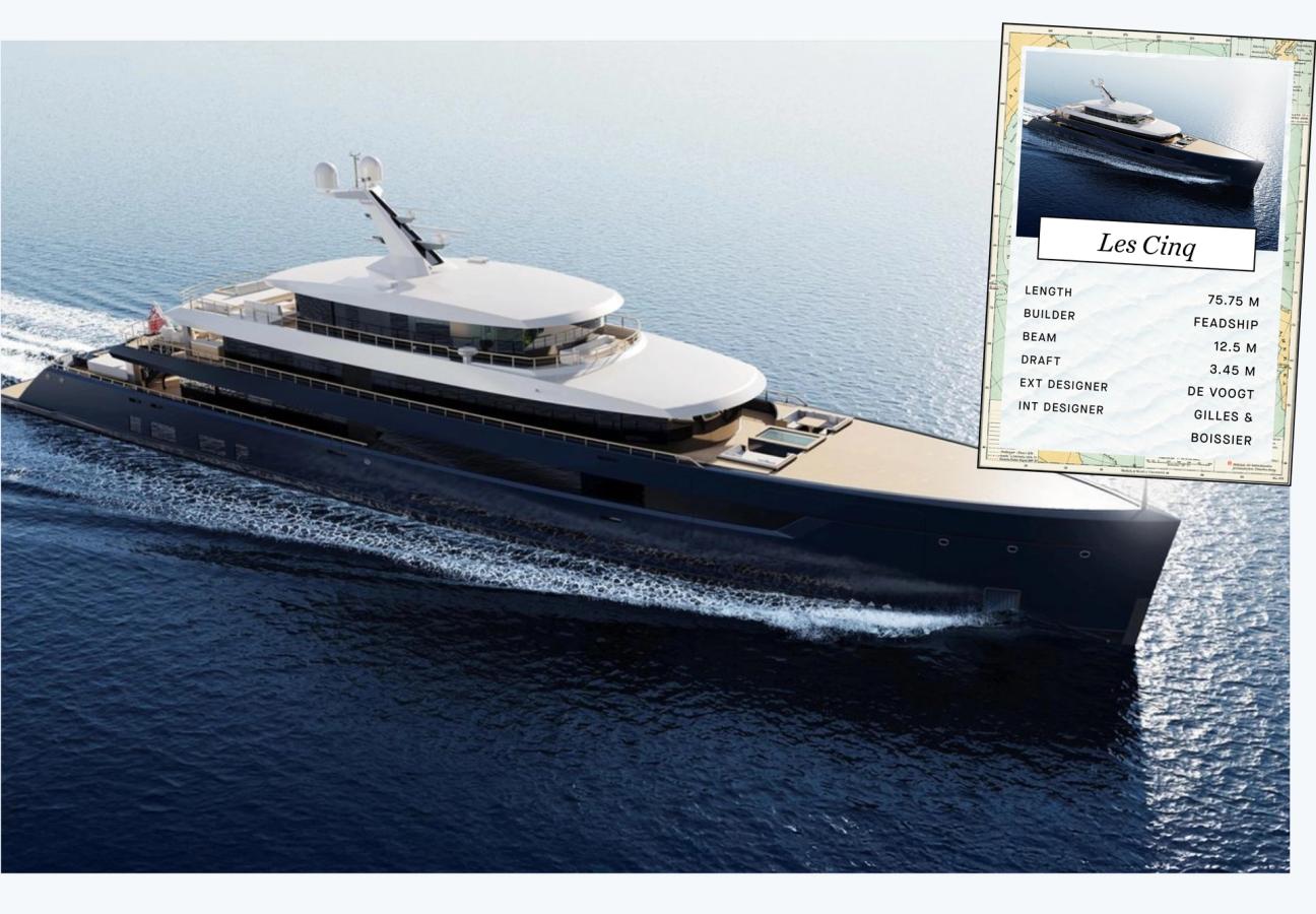 Les Cinq is a brand-new build and stands out with here the handsome blue and white exterior profile is penned by Studio De Voogt with naval architecture by Azure Naval Architects. She was originally named one however was renamed when she was sold to a very secretive owner. One accommodates a party of 12 and features two equally impressive master staterooms – one on the dedicated owner's deck, the other full-beam suite on the main deck – as well as four lower deck guest cabins with step-free access to the beach club that opens up to port and starboard. One stand out feature is distinctive herringbone teak decking is a first for the yard Feadship and extends to the foredeck which doubles as a "touch and go" helipad.