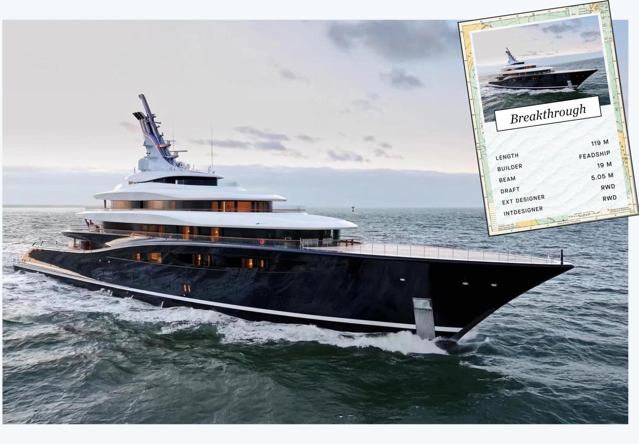 The superyacht Breakthrough was sold in 2025 to Canadian billionaire Patrick Dovigi. He acquired the yacht from its commissioner, Bill Gates, for a reported price of over $650 million. Built by Dutch shipbuilding cooperative Feadship, she is the world’s first hydrogen fuel-cell powered superyacht, designed to cruise emission-free over short distances on green hydrogen. Breakthrough has 14 balconies, seven unfolding platforms for direct sea access, an 8.2-metre (27 ft) infinity pool with contraflow, and an underwater viewing lounge. Yes an underwater viewing lounge is an essential.