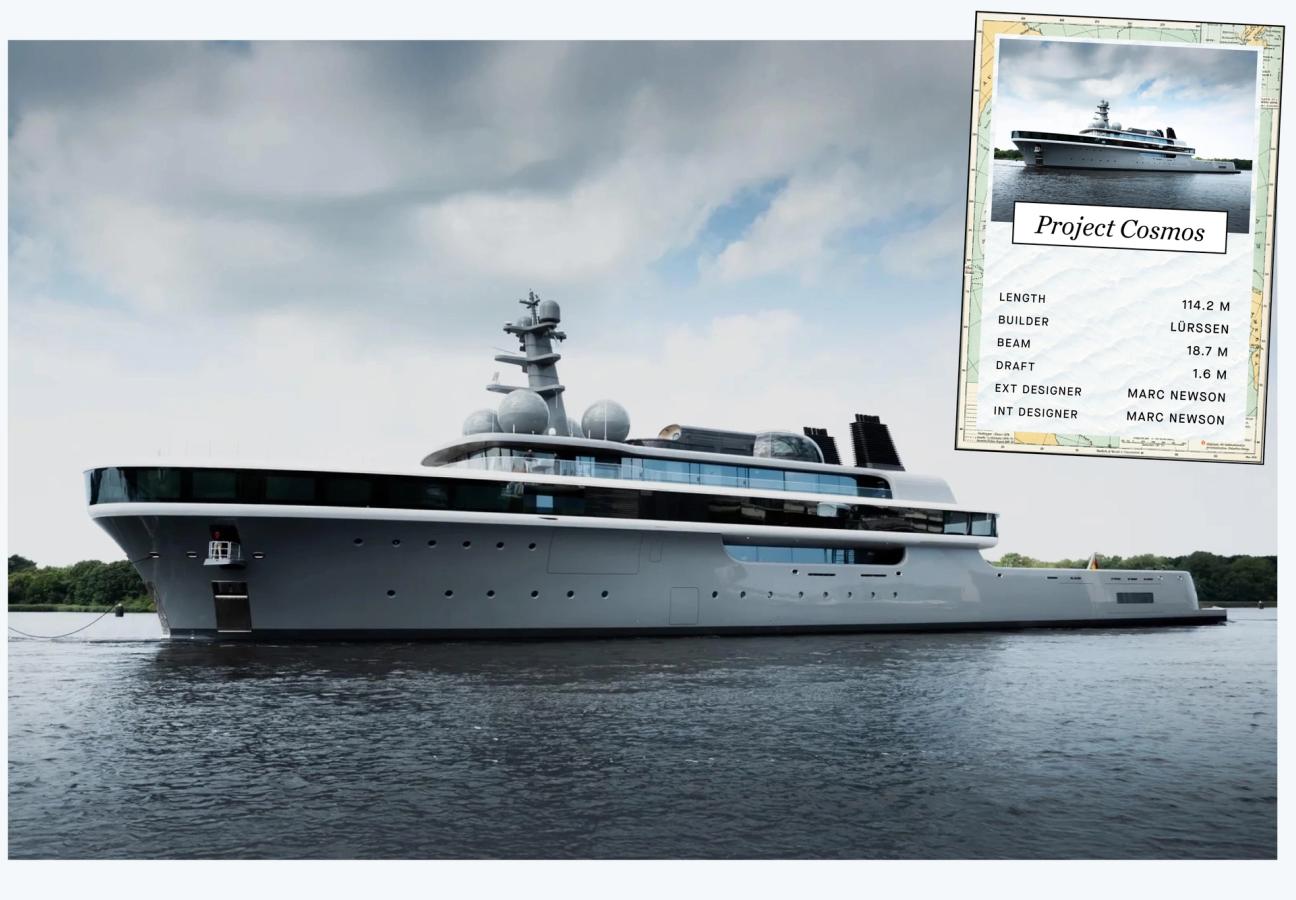 The owner of the superyacht Project Cosmos is Japanese billionaire Yusaku Maezawa. He is a fashion entrepreneur known for founding the online fashion retailer Zozotown. Maezawa is also an art collector and is known for his interest in space travel. Comos is one of the first yachts in the world to be fitted with fuel-cell technology and she can cruise up to seven knots for a range of 1,000 nautical miles. What makes her most recognisable is the large, glass dome, which is designed as a private owner's study connected to a terrace. A complex feat of glass engineering, Lürssen developed a custom solution to bend large sections of thick glass for undisturbed 360-degree panoramic vistas. We can unfortunately only imagine the views.