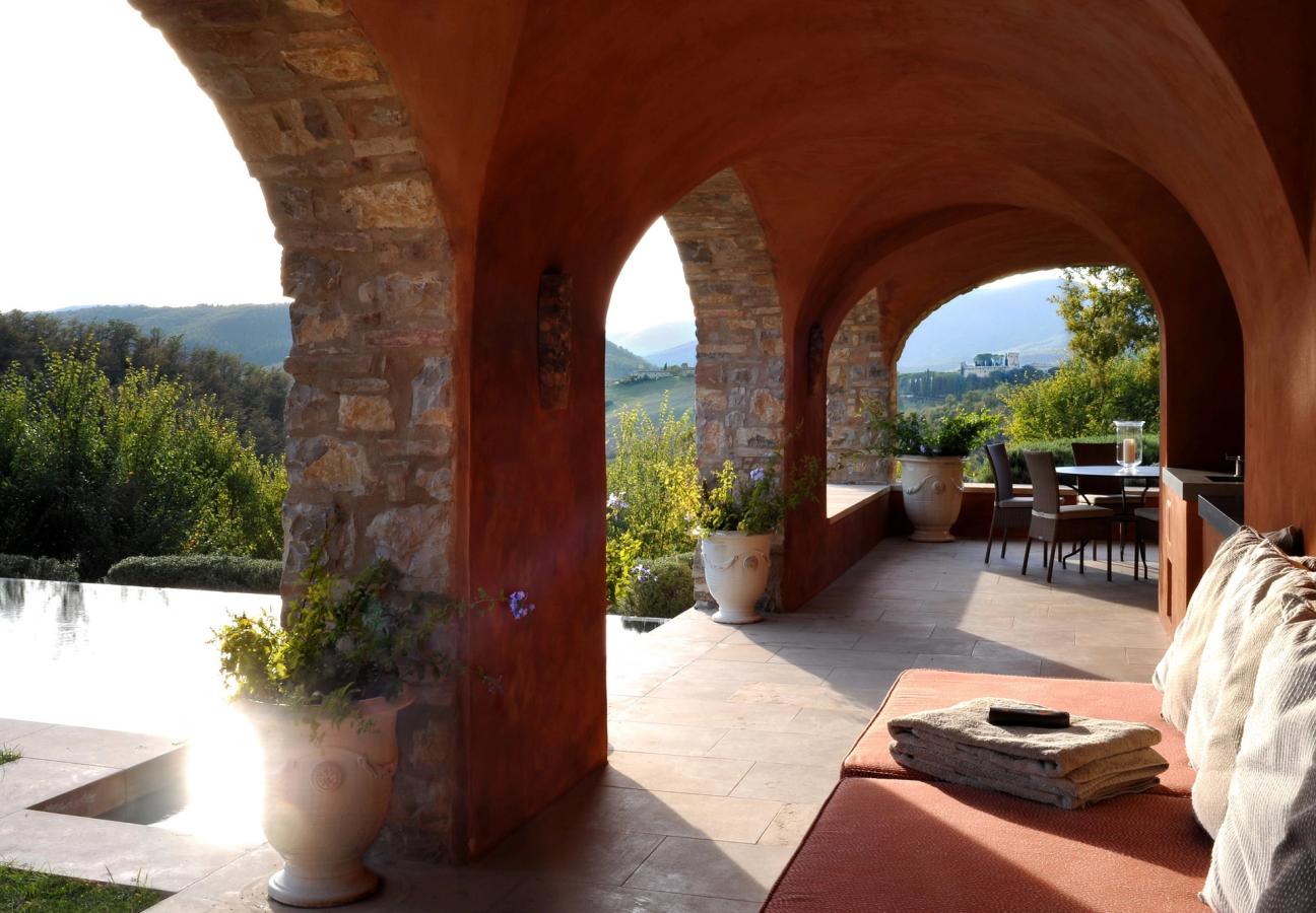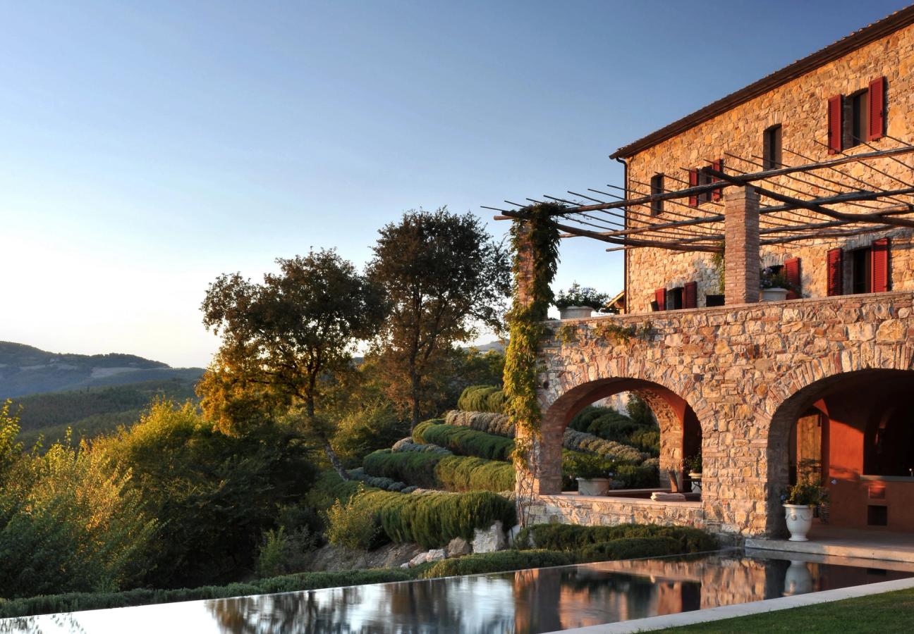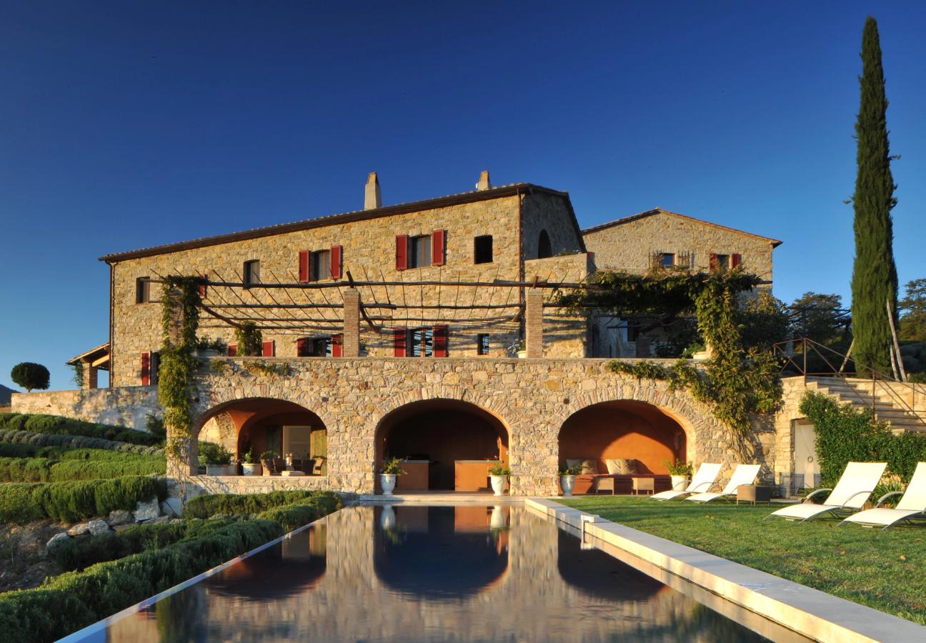 There are spacious living areas, and several outdoor dining areas with views over the rolling hills and the two castles, Castello di Reschio in Umbria and Castello di Sorbello in Tuscany.