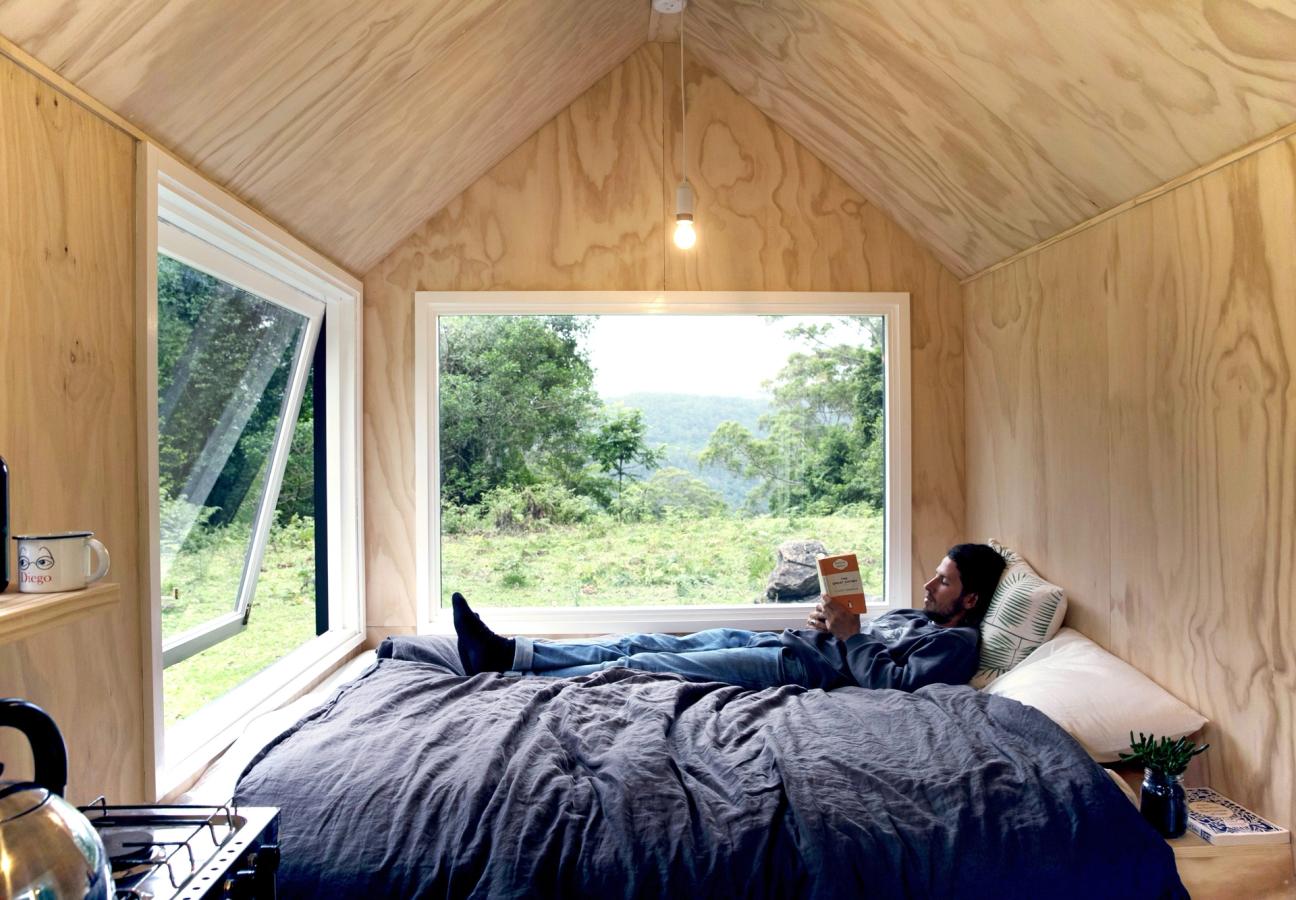 Hidden away in a secret location at the foot of a 400-year-old rainforest, this off-the-grid cabin is powered by solar panels and not much else.