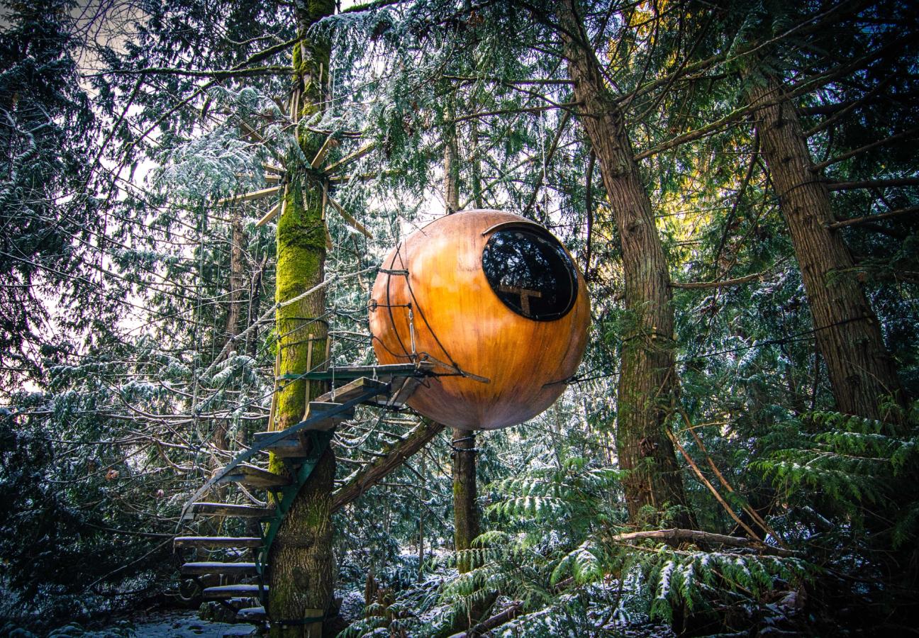 Suspended in the canopy of an evergreen forest are these gravity defying cabins that almost look otherworldly.
