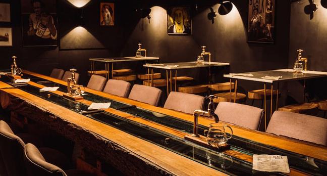 In this dark, subterranean enclave, pull up a chair at one of the metal tables or round the hollowed out-half of a tree that commands the room and serves as a table and whisky barrel. Containing 17 litres of whisky and lined with American and European oak, two separate taps pour forth the Cherry River, or a house blend of whisky, which is maturing all the time.