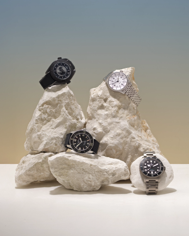 From top, clockwise: OMEGA Seamaster Planet Ocean 600M Worldtimer, £14,000, omegawatches.com; LONGINES Legend Diver 39mm £3,150, longines.com TUDOR Pelagos Ultra, £5,070, tudorwatch.com BLANCPAIN Fifty Fathoms Automatique, £16,800, blancpain.com