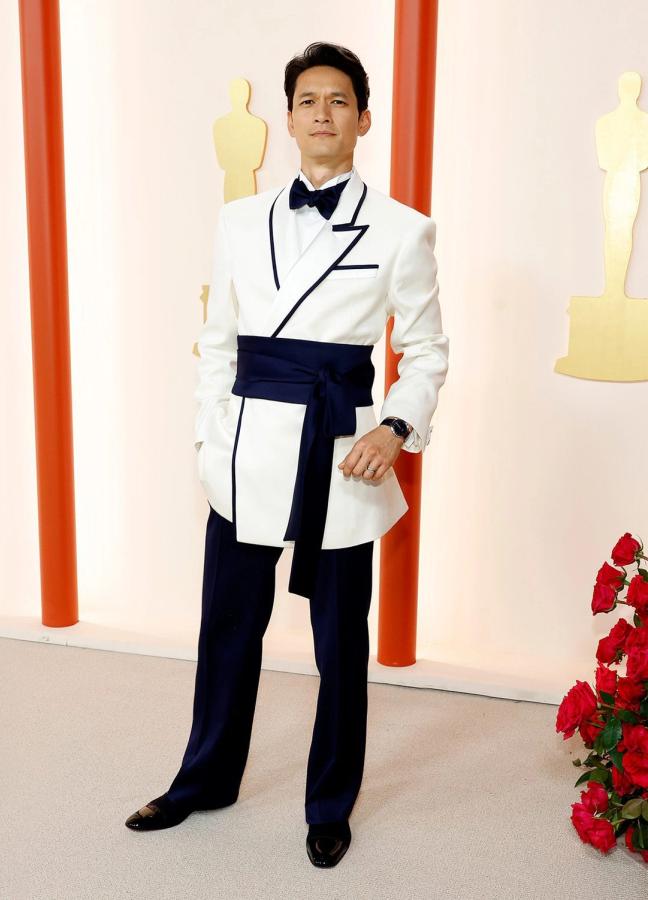 The Everything Everywhere actor gave traditional suiting a lovely touch via Adeam’s first men’s tux, which dropped the right lapel, introduced navy piping, and tied things up with a sash-style belt. “I wanted to create an evening look that expressed Harry’s multicultural background,” Adeam’s creative director, Hanako Maeda, said in an interview.