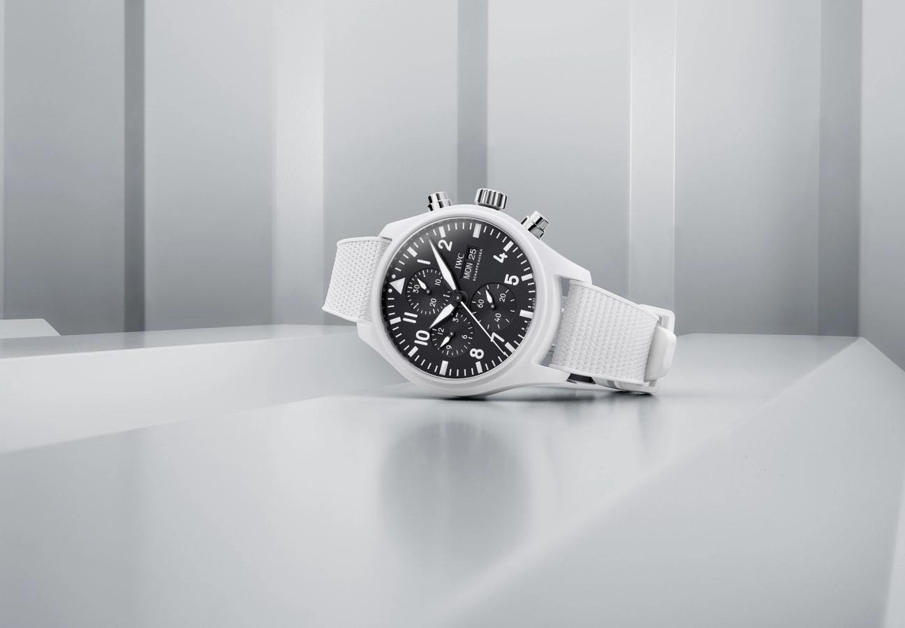 To whit: IWC’s fleet of Top Gun Pilot’s chronographs, in a new Pantone-accredited palette of white ‘Lake Tahoe’, green ‘Woodland’, ‘Jet Black’, among others – all realised in coloured ceramic. Two further are crafted from ‘Ceratanium’, which through near-alchemical feats of engineering, yields a titanium alloy watch, fused with a coloured zirconium-oxide ceramic surface. In other words, unlike Goose back in 1986, easily able to survive a flat spin and botched ejection.