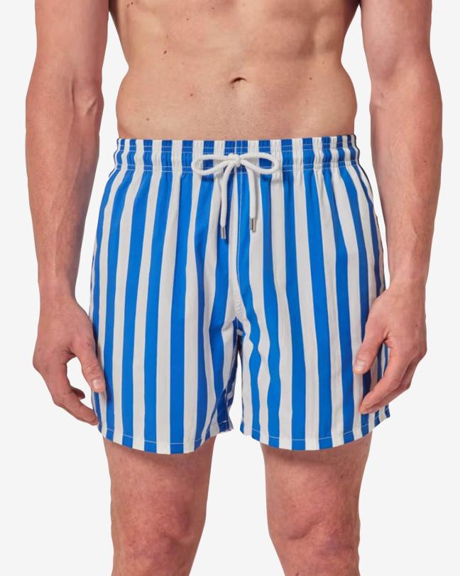 The Nautics swim shorts are Mr Marvis' signature go-to for poolside style. The bright blue and white striped men's swim shorts are cut from quick-dry seersucker fabric woven with polyamide and organic cotton and like with other Mr Marvis products, comfort comes first. An elasticated waistband and a soft mesh lining make these a delight to pull on.