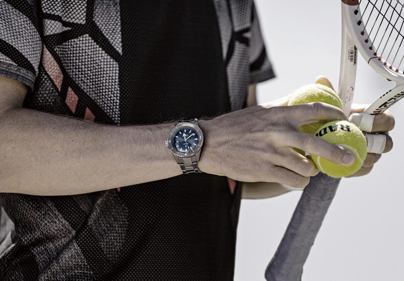 The sun-ray blue dial is lacquered, but endlessly legible — thanks to lashings of Super-LumiNova on the indexes and flanges. The polished bracelet is fitted with a titanium 3-fold clasp for added security and the 300-metre water resistance affords Norrie the opportunity to go from court to plunge pool without a second’s thought.
