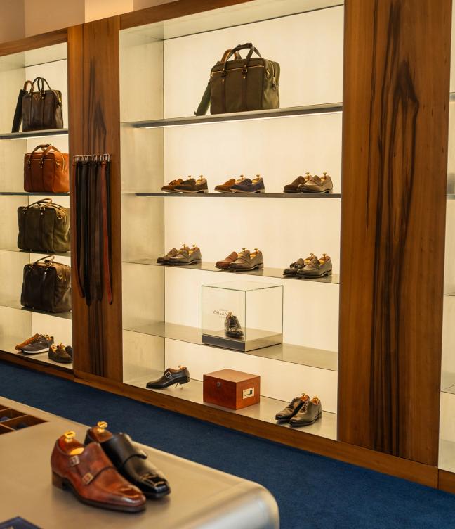 For an interactive, theatric feel – and one that creates a sense of intrigue among passersby – a polishing station is positioned at the centre of the store, where staff finger polish Cheaney shoes to a mirror-like finish. The service – which comes complimentary – is also there to underline the importance of caring for your footwear.