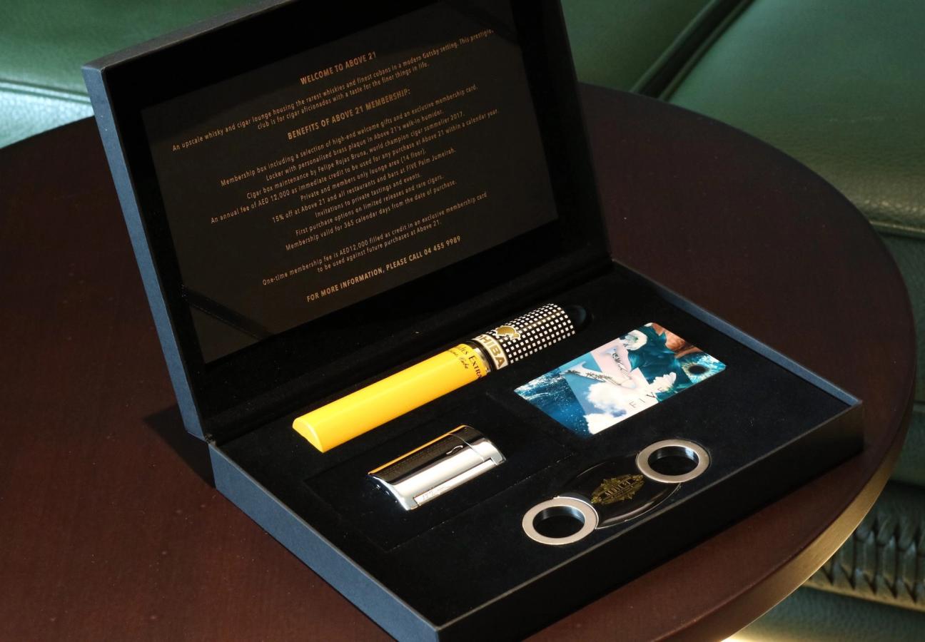 Top billing for the GJ: your own locker in Above 21’s humidor with a personalised brass plaque. Then there’s cigar box maintenance by Felipe Rojas Bruna himself, 15% discount on food and beverages across the FIVE Palm Jumeirah, exclusive invites… the list goes on. Oh, and did we mention your chance to literally go up in the world, with access to the members only lounge on the 14th floor.