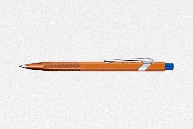 Swiss stationer Caran d’Ache has enlisted Swiss-Argentinian designer Alfredo Haberli for its latest colourful collaboration. This bright orange mechanical pencil has a hexagonal aluminium body, a silver metal clip and a blue striated button with incorporated lead sharpener. Ideal for your home office.
