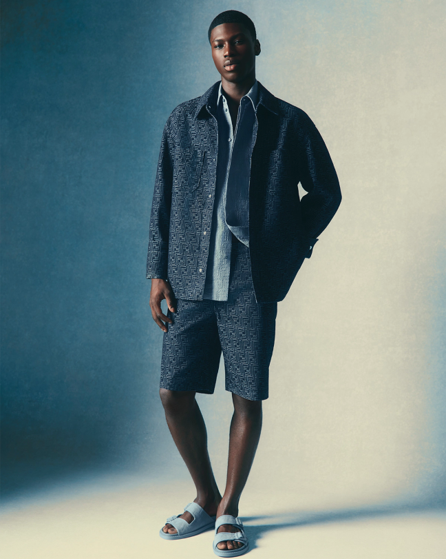 FENDI Go-To jacket in Fendi Zucca denim, £1,600, shirt in linen with Fendi Zucca stitching, £1,150, shorts in Fendi Zucca denim, £950, all fendi.com