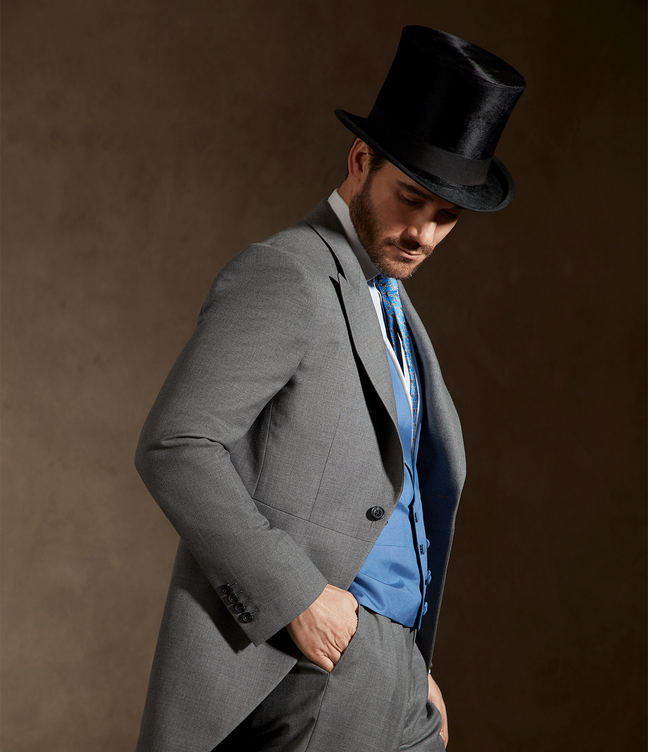 You will be able to choose from a black, grey or navy single-breasted morning coat with peak lapels. As mentioned, the tails of the coat should fall to the back of the knee, and the coat should button across the natural waistline. The top of the collar and shirt cuff should show the same amount – about half an inch.