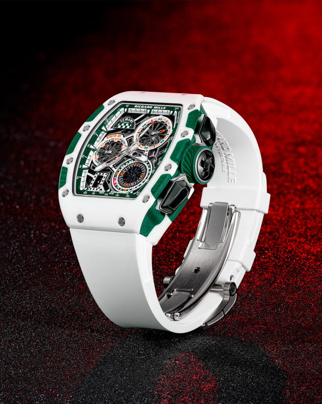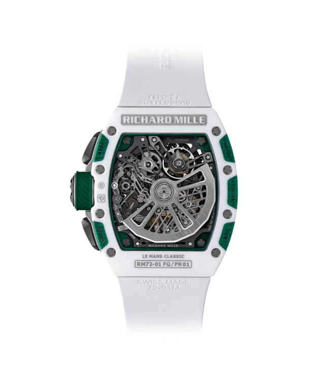 The new RM 72-01 Le Mans Classic measures 38.4mm in diameter by 11.68mm-thick, with an overall lug-to-lug distance of 47.34mm. Held together by spline screws in grade 5 titanium, the case components are made from green and white Quartz TPT. Once cut, the exposed weave of the threads gives Quartz TPT components an asymmetric wavy appearance that is somewhat similar to the black and gray lines that are characteristic of carbon fiber components. Richard Mille explains: “Watches have been specifically developed for every edition since 2008, each one in the event’s colours. This edition, the RM 72-01 Le Mans Classic, is no exception in joining all the previous editions that have all become collectables.”