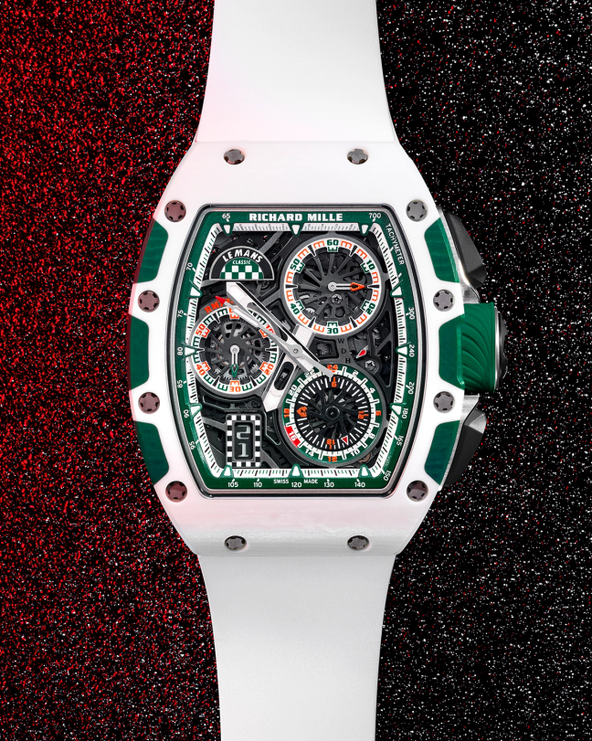 Richard Mille and Le Mans Classic joined forces back in 2002. Now in 2023 celebrating 100 years of Le Mans and we have the all new RM 72-01 LMC – limited to 150 pieces (no doubt they will fly!). Although the design and layout of the new Richard Mille RM 72-01 Le Mans Classic is largely the same as the original RM 72-01 that debuted in 2020, the use of green and white Quartz TPT (a composite material that consists of hundreds of fine silica threads that are woven at a 45-degree angle and bonded together with resin before being cut and machined to shape) gives the new model a different vibe, with contrasting green segments between the screws on the front and back components of the case. The RM 72-01 is Richard Mille’s current flyback chronograph model, and it has been offered in a handful of different materials and configurations. A key design distinction here is the ’16’ on the 24-hour counter, which is underlined in red, a nod to the traditional start time of the endurance race.