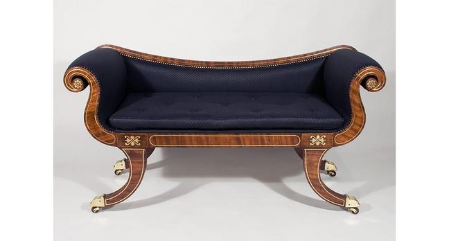 Wakelin & Linfield Regency period mahogany and brass inlaid sabre legged window seat