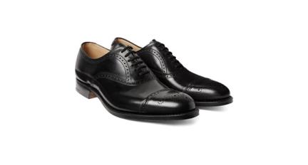 Shoes must be black. Oxfords are the conventional choice, though plain derbies are a strong substitute. The conservative wisdom is that brogues are not quite formal enough. Shoes should be highly polished.