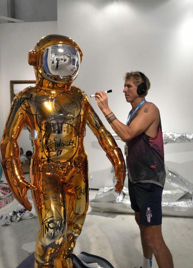“Working with this reflective chrome material was always a conscious decision on my part,” says Brendan, in an accent inflected by the eclectic array of regions he has called home over the years. “Firstly, I just like how it looks! But secondly, I noticed something amazing happening when people came close to get a good look at the spaceman. I could see them being drawn to his visor like it’s a mirror — and they got lost into it, and I thought to myself ‘that’s something I want to experiment with’.”
