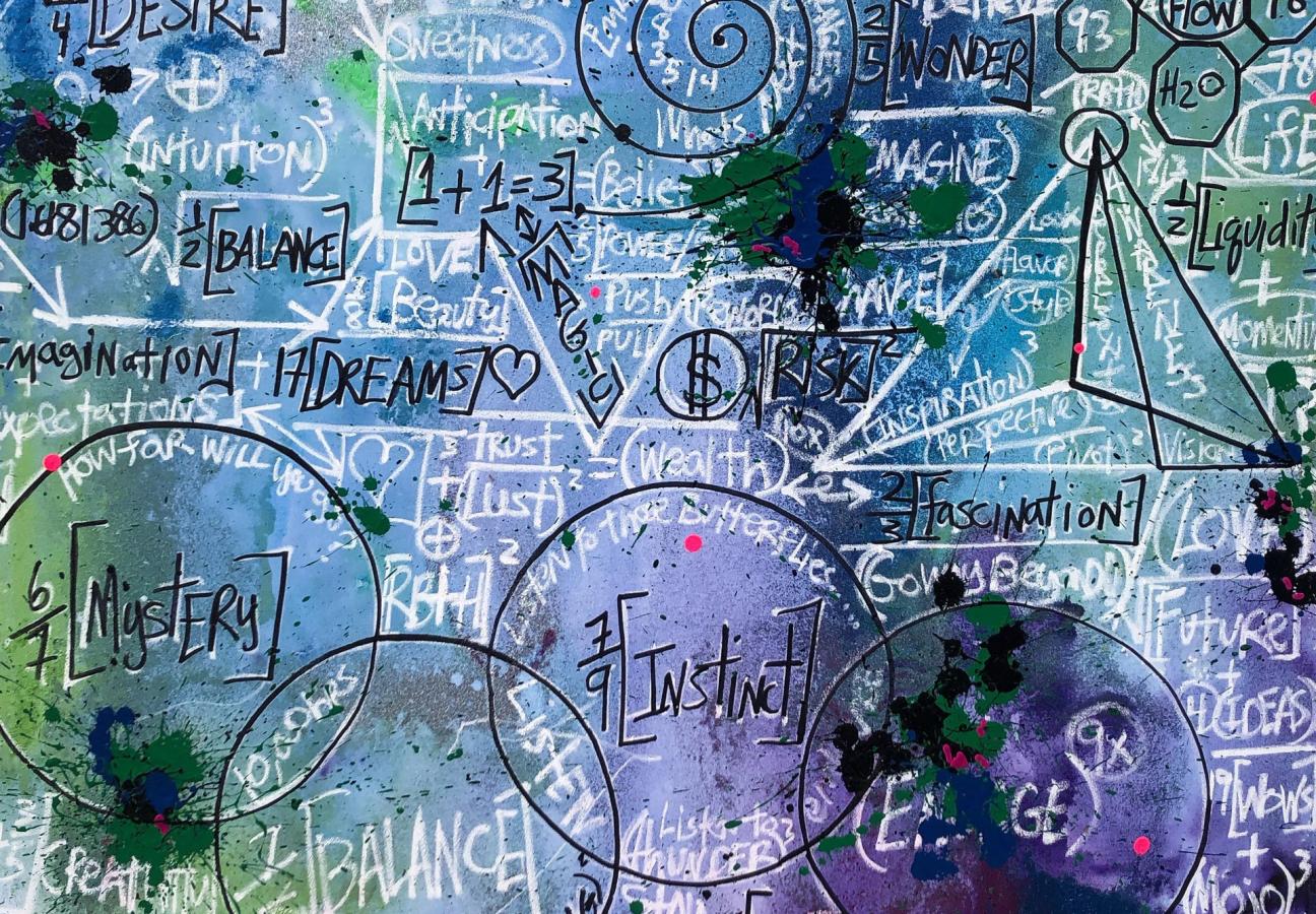 Scribbled in what I imagine is a deceptively haphazard way across his work, are equations littered with everything from Bruce Springsteen lyrics to words including lust, love, passion and Rock’n’Roll. All, it would seem, with an aim to provoke the viewer, helping them to be present and in tune with their emotions.