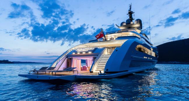 The owner’s suite is panelled with onyx, boasts a walk-in rain shower and can be accessed via the private owner’s study. The main aft deck terrace features built-in sofas and creative LED lighting.