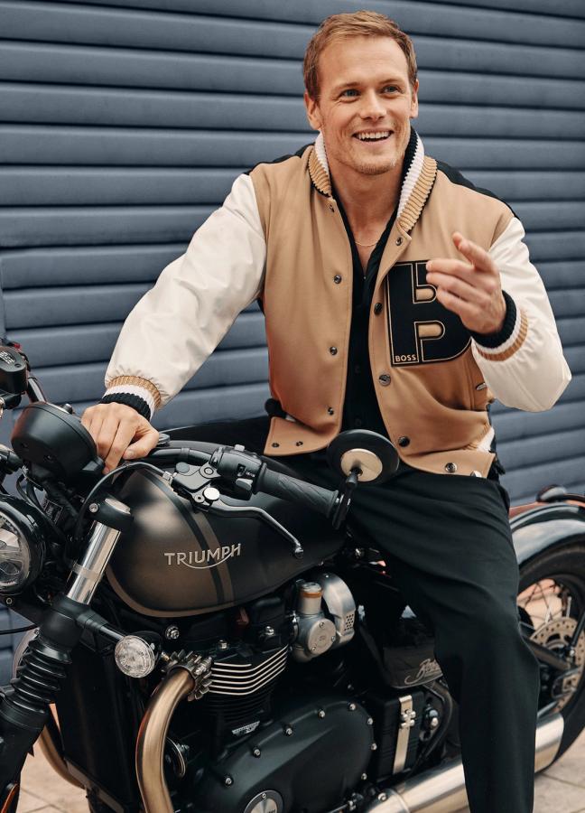 When Sam Heughan smiles, you smile. It’s a given; a guarantee — a beaming, pearly-white law of good-natured nature. It’s one of those rare smiles, brightly flashed and seemingly blessed with mystical, magical powers. And nothing in this world makes the Scot smile more freely and infectiously than a good motorbike. Thankfully, we’ve brought along a Bonneville Bobber today for the actor to play with; one of Triumph Motorcycles’ most stylish, vintage-tinged two-wheelers.