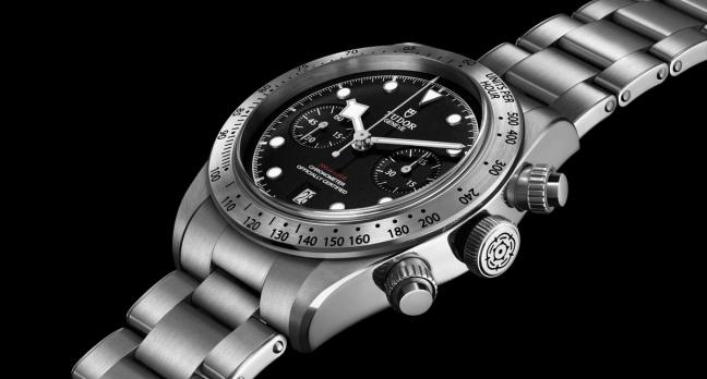 Closer inspection also reveals that the unidirectional rotating bezel, traditionally found on the Black Bay dive watches, has been replaced with a fixed bezel in circular satin-brushed steel, complete with an engraved tachymetric scale. Fluted, screw-down pushers at 2 and 4 o’clock are used to start, stop and reset the chronograph.