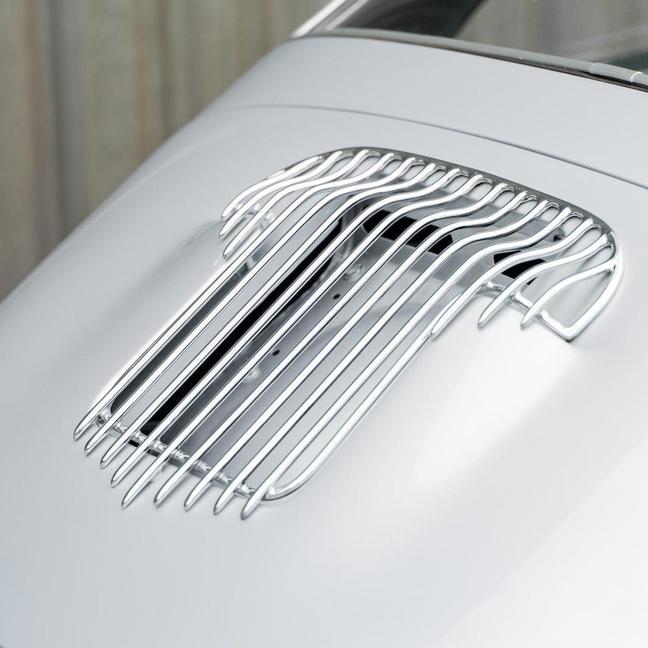 He removed the bumpers, extended the nose, added frenched headlights, a rear scoop with custom grille, handmade taillights, and roof vents. And then, for the perfect finish, he used pearls and metal flake to colour the car silver — before using aircraft clear as a topcoat.