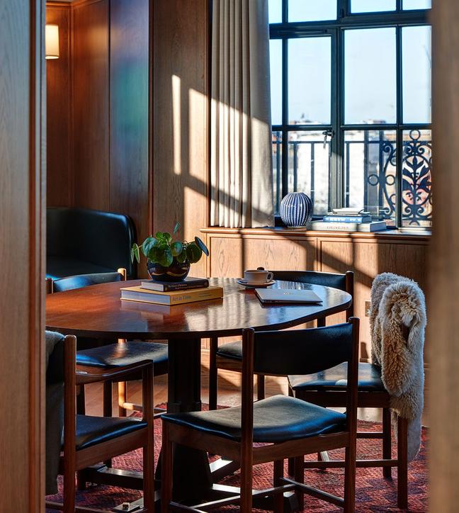 If you prefer to work a little more collaboratively, or simply want a break after a few hours of emails, you can take the lift to the more lively and sociable fifth floor. It’s certainly very inviting, with its modern and vintage furniture, mid-century library, fireplaces and central bar.