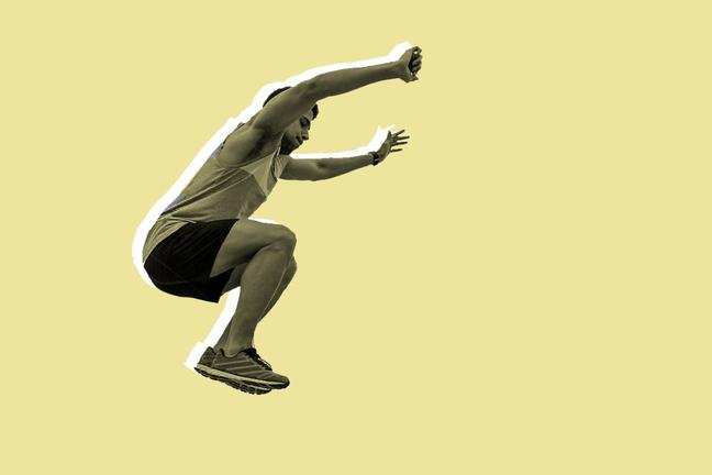 Now this is a great way to lift your heart rate. With your legs shoulder-width apart, perform a long jump — focusing on a soft landing to reduce the impact on your knees. Jog backwards to your starting position and repeat. For an extra challenge, add a burpee before you jog back!