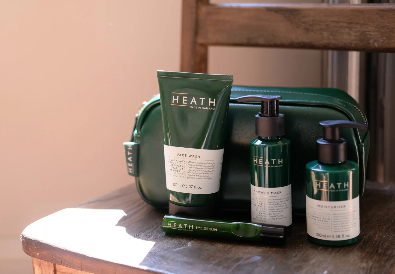 Heath’s Facial Routine Kit is a comprehensive four-piece ensemble designed to fully revive one’s appearance, without any fuss. It includes a cleansing and clarifying Face Wash, a Moisturiser boosted with hyaluronic acid, a soothing Eye Serum and an exfoliating Shower Mask. It’s all presented in a bottle-green vegan washbag.