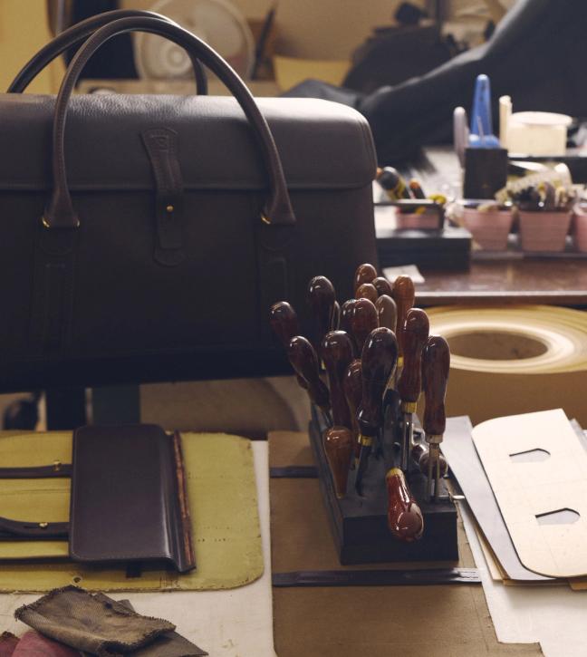 “And we have the patterns for every style we have ever made,” says Tusting, “so we can recreate them even if they are a style we no longer sell. We did this recently for India Hicks — she wanted a recreation of her partner David Flint Wood’s very old and tired Tusting Clipper bag. It needed to be a faithful reproduction, but with some personalisation and also some customisation in the shape of a special leather-free handle, since David is actually allergic to leather. All of this was possible and made for a very special gift”.