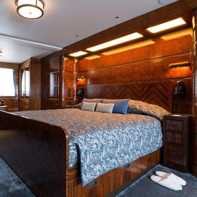 Guy Oliver, the design mastermind behind the staterooms of 10 Downing Street, recreated the stunning period interior – adding a couple of 21st century comforts to update the yacht for the modern age. A blend of prints and solids, soft-to-the-touch materials and striking woods were employed to evoke the Art Deco feel, and grand bathrooms with tubs, writing desks and cosy seating areas were included to create an elegant and captivating interior for 10 guests.