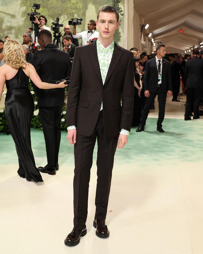 Wearing custom Prada, Harris Dickinson played into the botanical theme with a shirt intrinsically emblazoned with emerald shards.