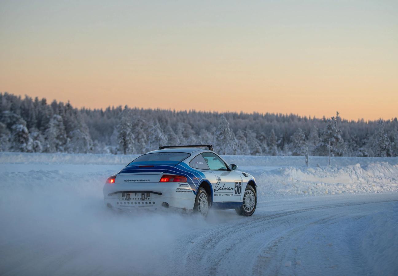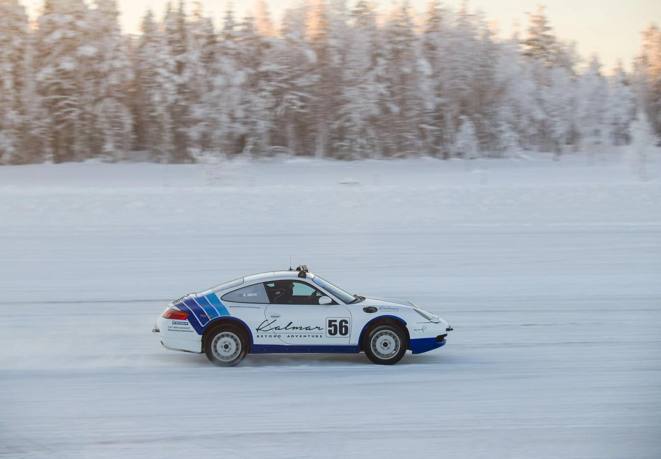 The narrow, winding track in front goes up and down, as though it were a bobsleigh run through Finland’s dense Arctic Forest. My car is a Kalmar RS-6, a modified 996 Porsche 911 wearing studded, ice-crushing Michelin tyres – the kind typically found on World Rally Championship cars.