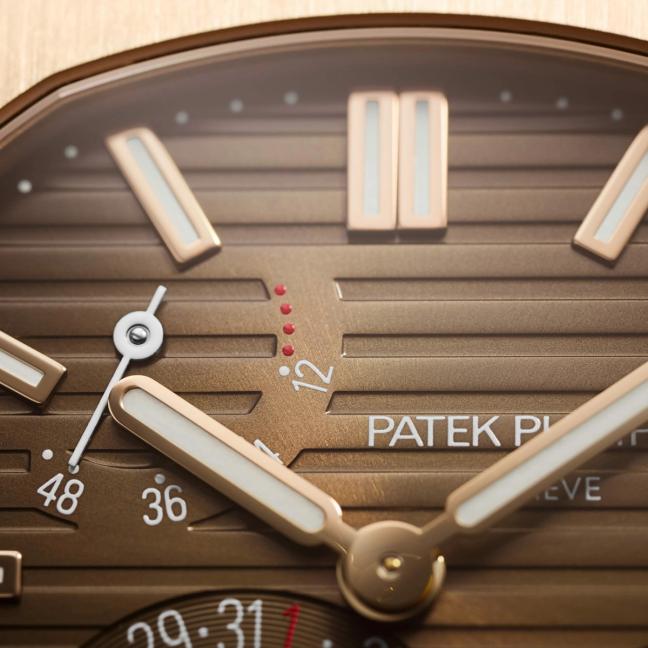 Up next is the new Ref. 5712 Nautilus, made with moon phases, an analog date, and a power-reserve indicator, and is aesthetically defined by its rose-gold case and bracelet, and a brown sunburst dial. The case, which is water resistant to 60 meters, the link bracelet and the octagonal bezel all beautifully offset satin and polished finishes.