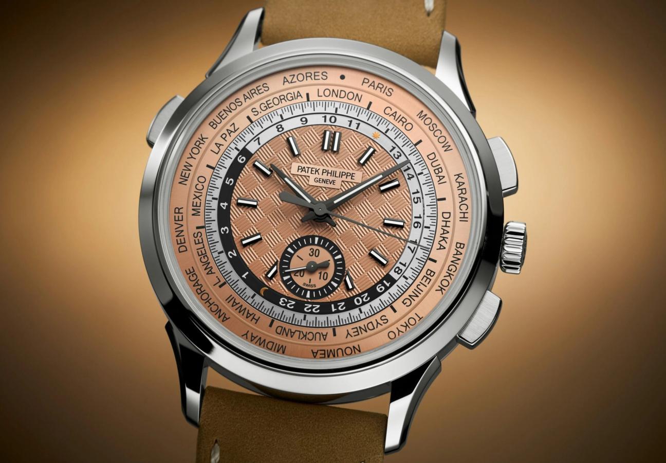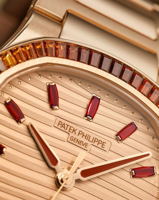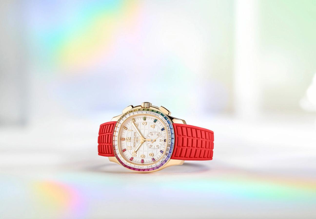 Elsewhere, the design of the new self-winding stainless-steel Ref. 5935A Worldtime Flyback chronograph is defined by a “carbon” motif in the middle of the dial, and the bezel of the Ref. 7968 Aquanaut Luce “Rainbow” chronograph is doused with a variety of rainbow baguette-cut diamonds and sapphires.