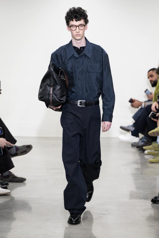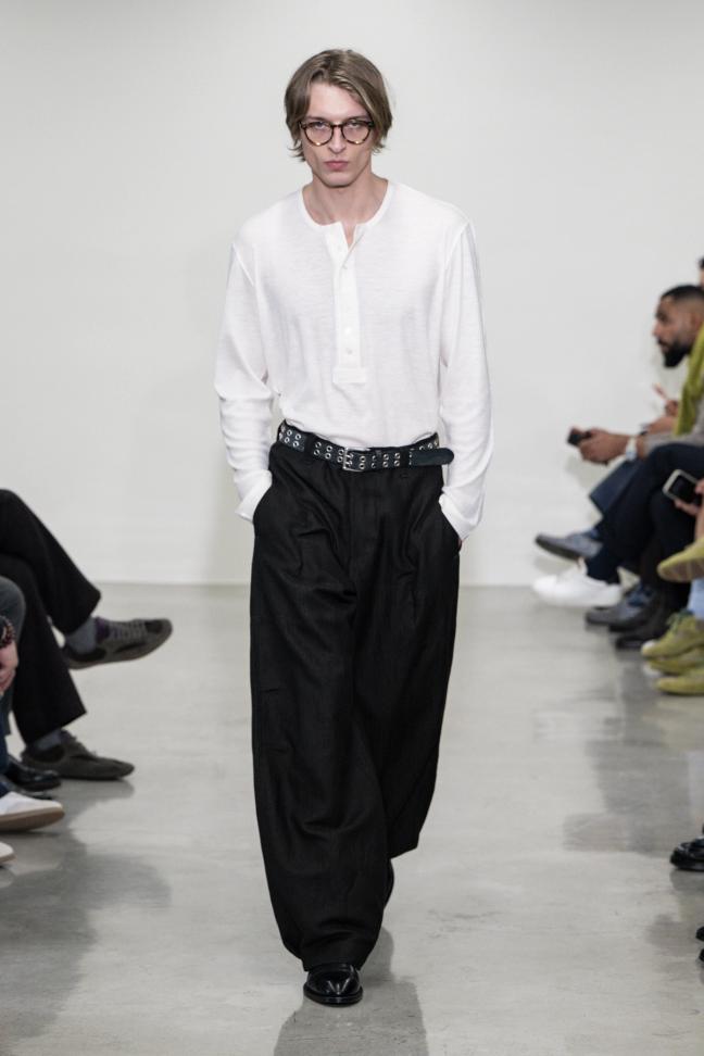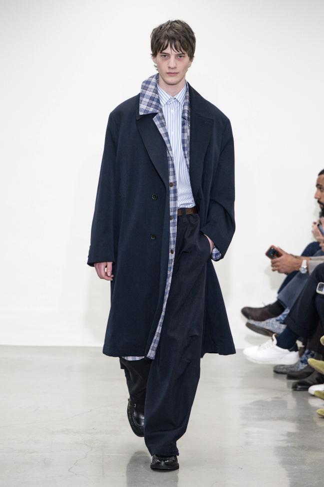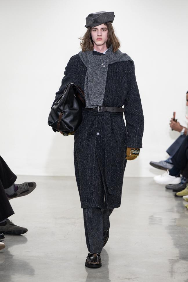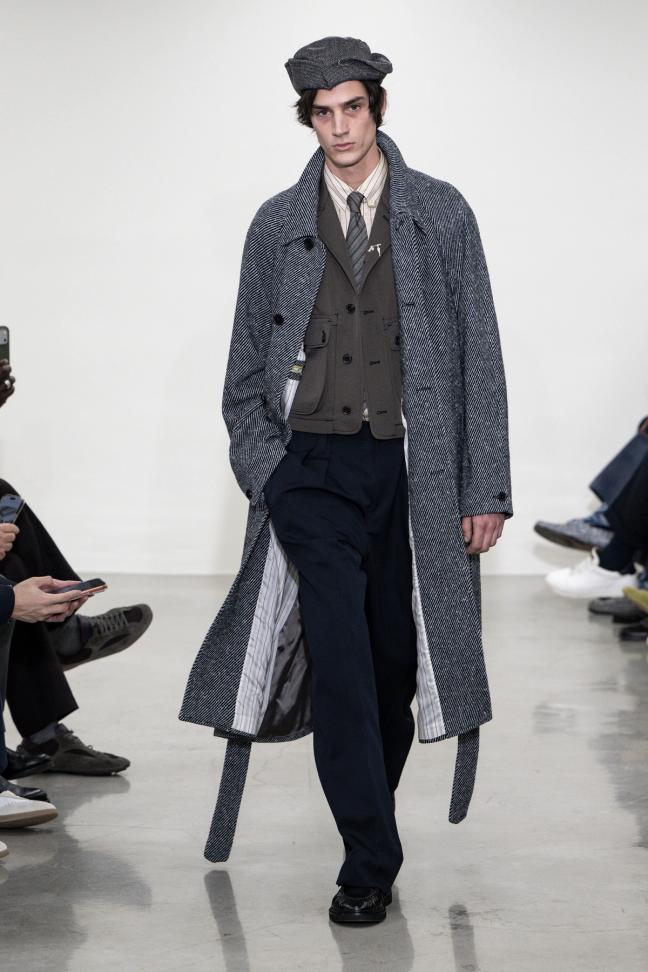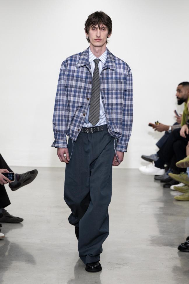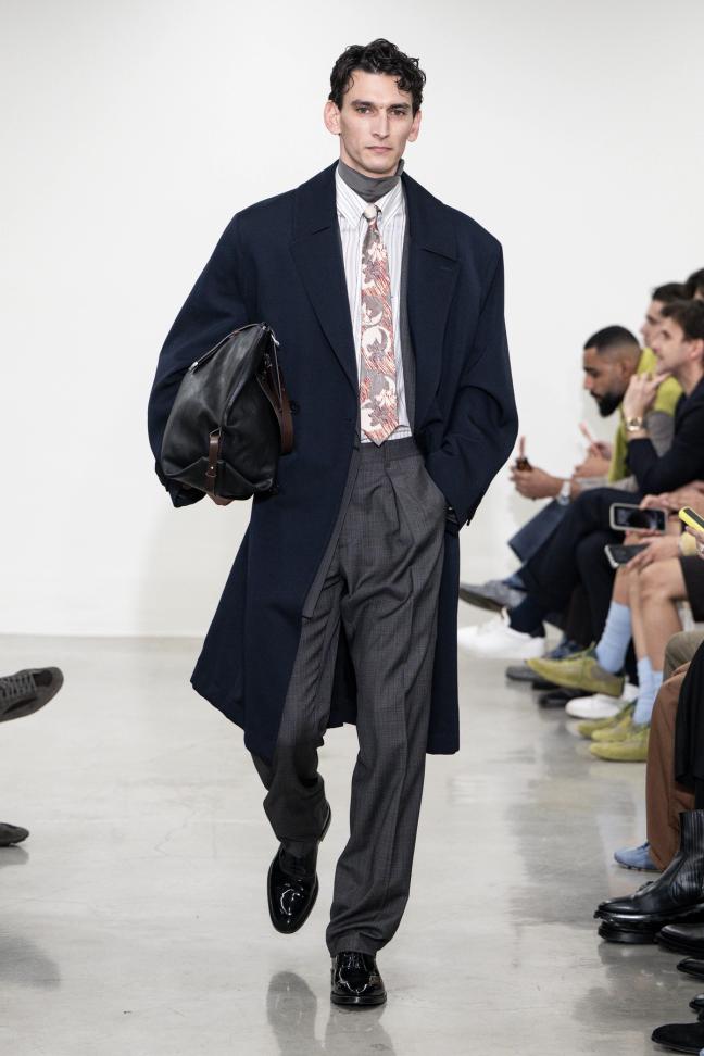 Tailoring, as you would expect, plays a huge part, and inspiration has been taken from the 1980s and 1990s’ slightly oversized tailoring silhouettes. Paul, before the show, chatted to me about his love of oversized tailoring due to its ease of movement when compared with more modern tailoring. This practicality continues with the inclusion of deconstructed and inside-out details.