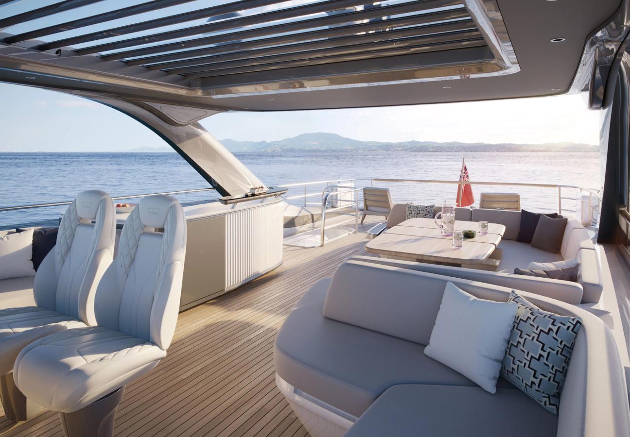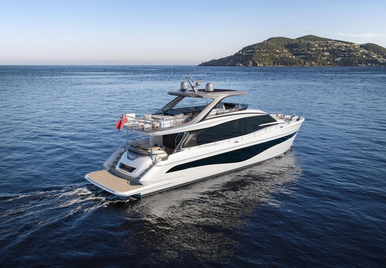 Uncompromising and relentless, the latest yacht from the British boatmaker has twin V12 ‘MAN’ engines, an increased beam and distinctive window line graphics…